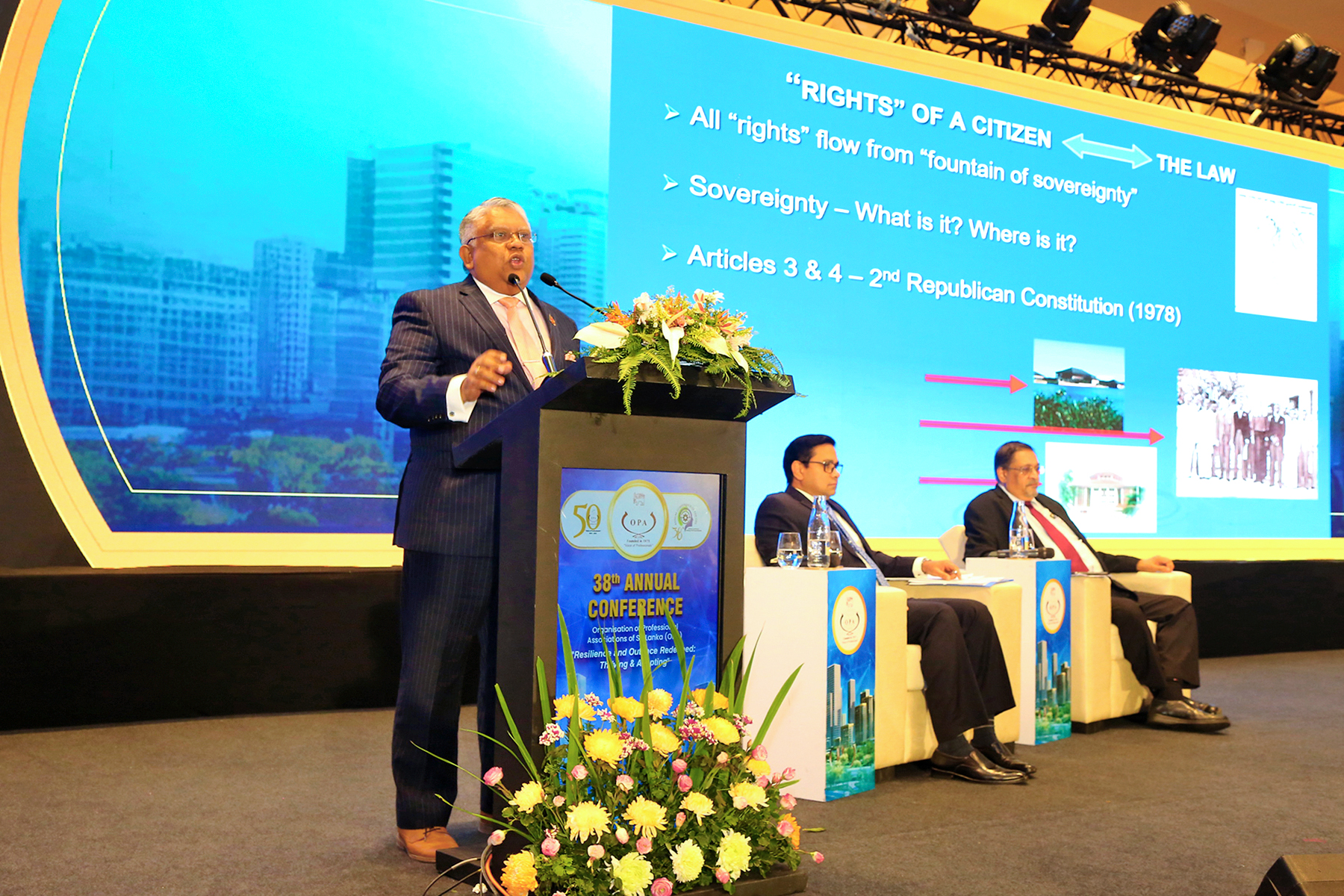 The logo of the 38th Annual Conference reflects the belief that “A man’s strength, adaptability, and knowledge will guide society toward resilience and flexibility, leading the nation toward growth and prosperity.” This message is also conveyed in Sinhala and Tamil, reinforcing inclusivity and the OPA’s commitment to representing all sectors of the professional community across Sri Lanka. The logo serves as a visual narrative of how professional leadership, innovation, and ethical stewardship can transform challenges into opportunities, propelling Sri Lanka toward a prosperous and sustainable future.