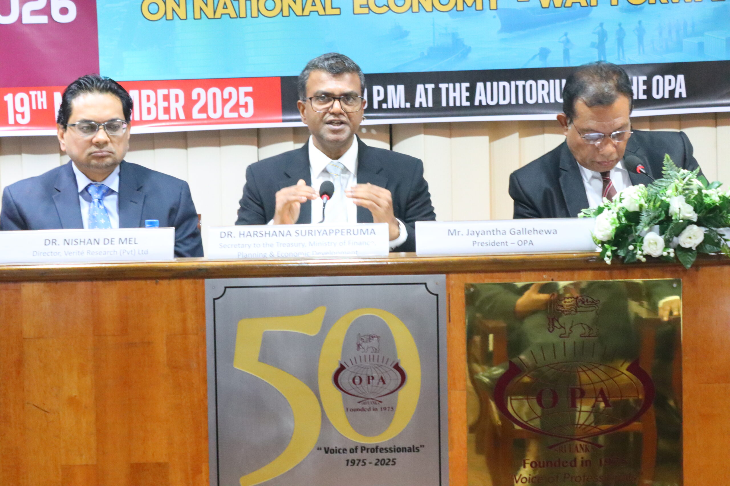 A seminar on “Impact of the Budget on the National Economy –Way Forward” was conducted by the Organisation of Professional Associations of Sri Lanka on 19th November, 2025 at the OPA Auditorium. The Keynote Speaker was Dr. Harshana Suriyapperuma, Secretary to the Treasury and Secretary to the Ministry of Finance, Planning and Economic Development while the panel of expert guest speakers consisted of Mr. J. P. R. Karunaratne, former Deputy Governor of the Central Bank of Sri Lanka; Ms. S. Iyesha Asanthi, Commissioner of Tax Policy and Legislation at the Department of Inland Revenue; and Dr. Nishan De Mel, Director of Verité Research.