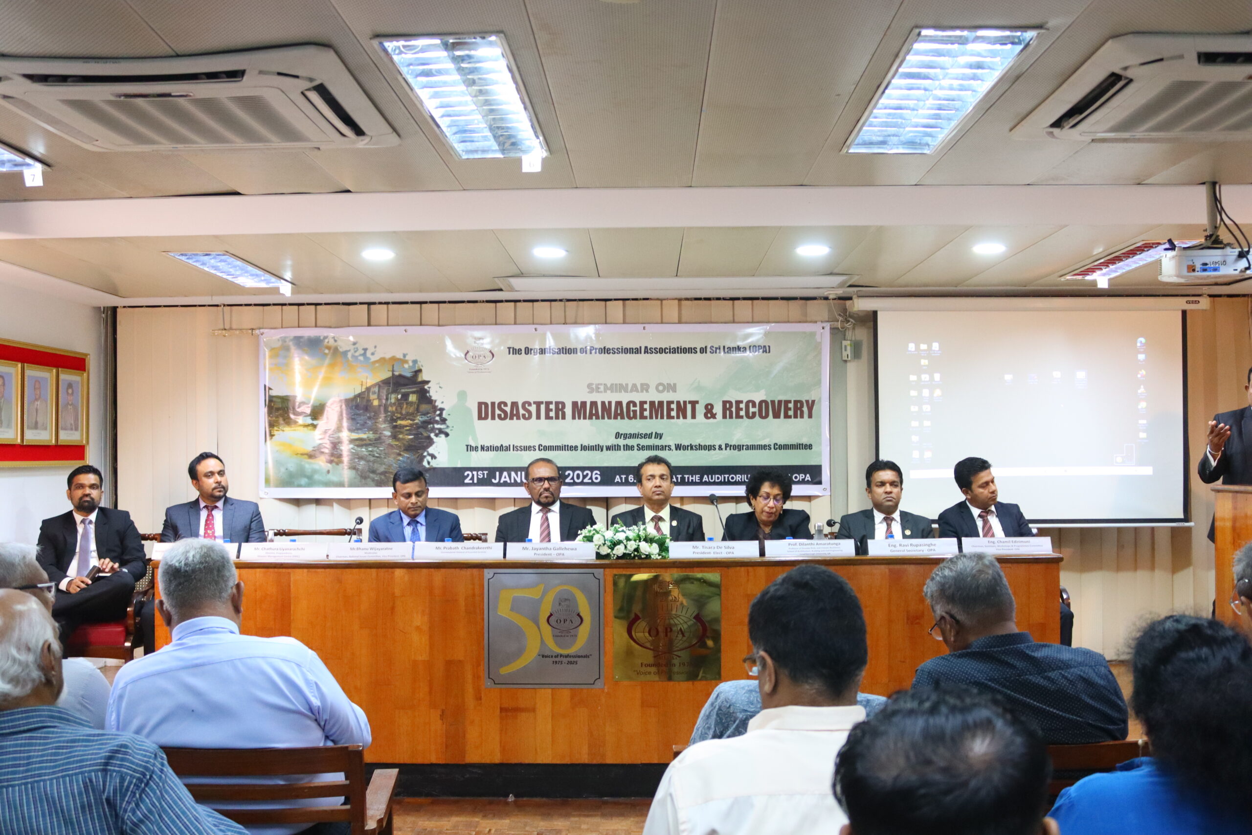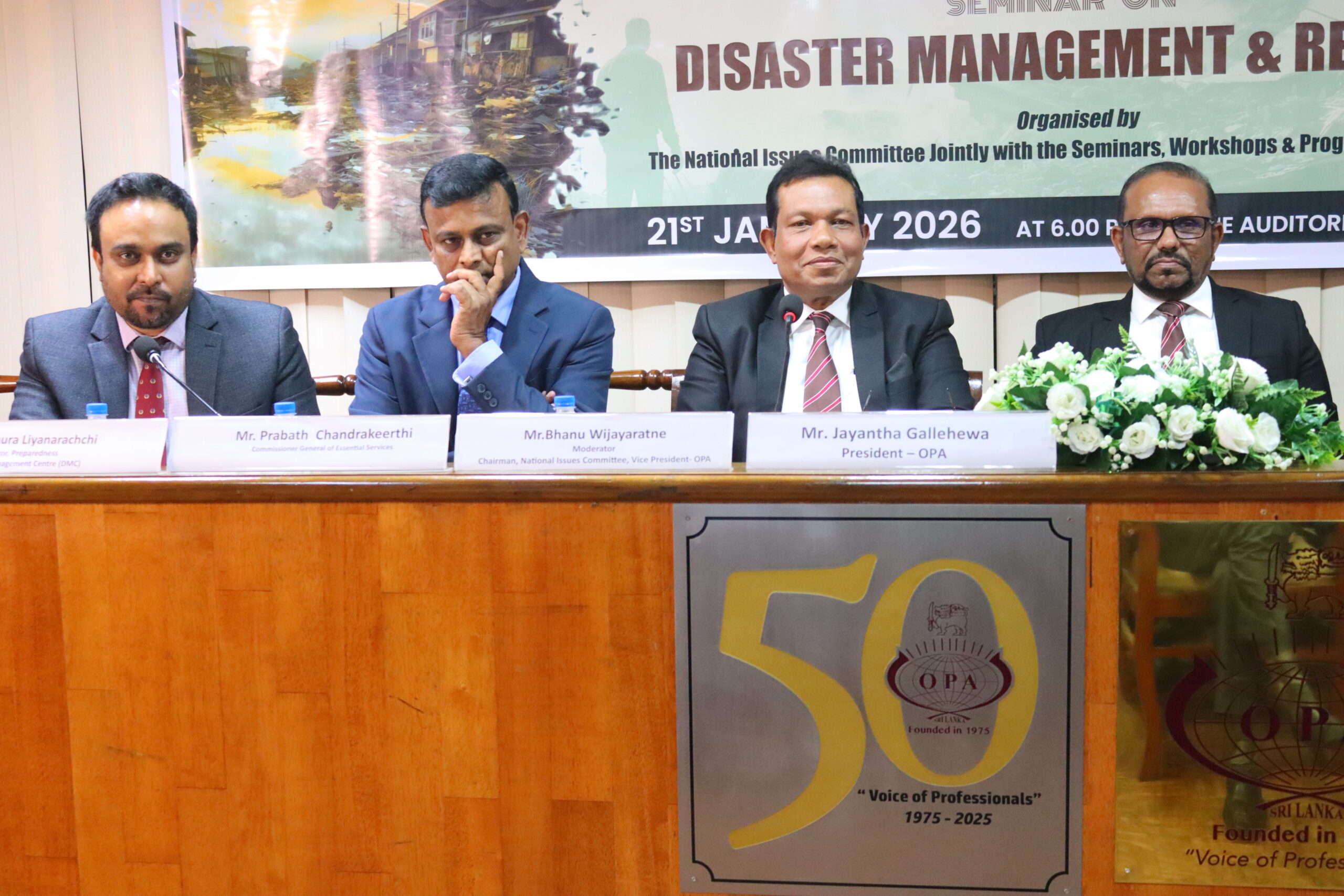The National Issues Committee and the Seminars, Workshops and Programmes Committee of the OPA jointly organized a seminar on “Disaster Management and Recovery” on the 21st of January at the OPA Auditorium. The event featured Professor Dilanthi Amaratunga, Professor of Disaster Risks and Climate Resilience, Loughborough University, UK, Mr. Prabath Chandrakeerthi, Commissioner General of Essential Services, Mr. Chathura Liyanaarchchi, Director Preparedness, Disaster Management Centre and Mr. Chinthaka Rathnasiri, Director, Human Settlements, Planning and Training Division, National Building Research Organization as guest speakers.